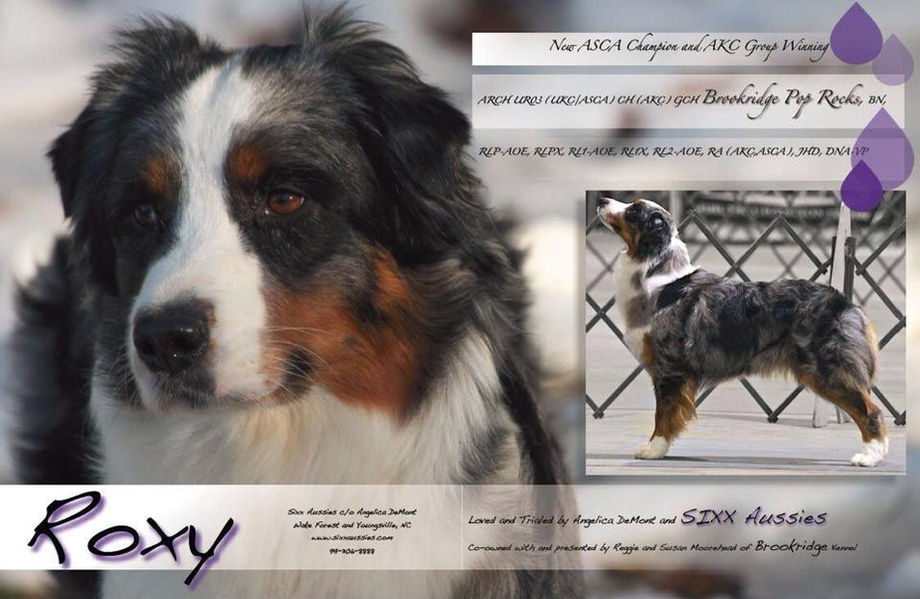 Roxy was named in honor of her esteemed grandmother, the winningest female Aussie in AKC history, Agua Dulce Popcorn Poppers (Pop), and a club my husband headlined at in the 90's, The Roxy.